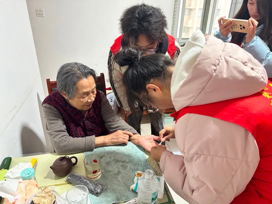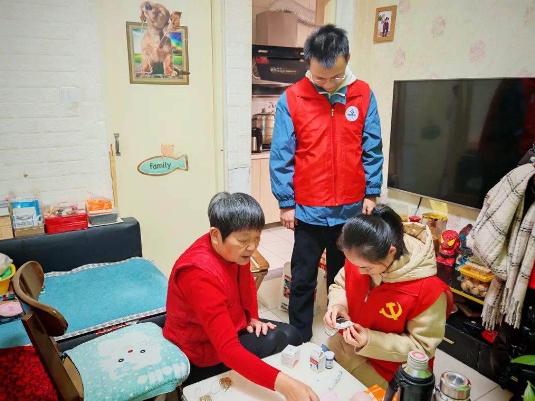 活动伊始,志愿者们询问了老人的生活情况,通过简单的聊天迅速拉近了和老人的距离。随后,志愿者们精心打扫了房间卫生,拿出血压仪和血糖仪,熟练地帮助老人进行测量,并耐心地进行健康知识的科普。面对热情、开朗的青年志愿者,老人们的脸上露出了欣慰的笑容。