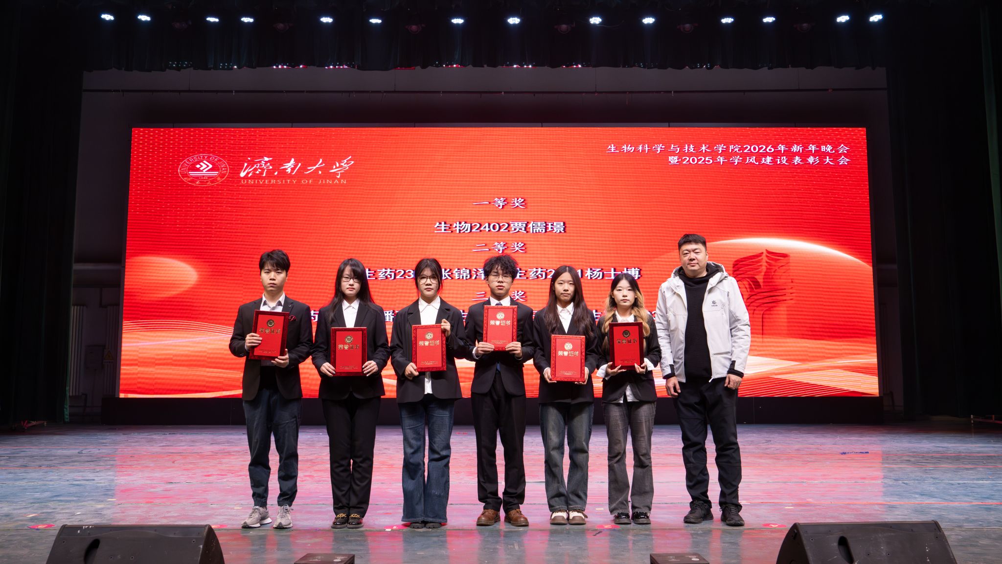院长秦晓春宣读了学院2025年度表彰决定。现场隆重表彰了学院在教学、科研、育人工作中取得突出成绩的先进个人,她勉励全院师生,以榜样为引领,见贤思齐、奋勇争先,合力书写学院发展的崭新篇章。随后,学校领导、职能部门、校友代表先后为“突出贡献奖”“科研创新奖”“教学卓越奖”“科创育人奖”的获奖教师代表,以及优秀学生代表颁奖。表彰环节后,精彩纷呈的文艺演出将晚会推向高潮。整场晚会分为“星光汇聚,生科闪耀”“激扬青春,携手同行”“砥砺奋进,筑梦启航”三大篇章。
