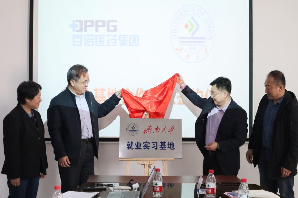 座谈结束后,双方共同签订就业实习基地协议。学校孙翔玲、董俊杰与百诺医药集团卢朋尧、刘理南共同为就业实习基地揭牌。