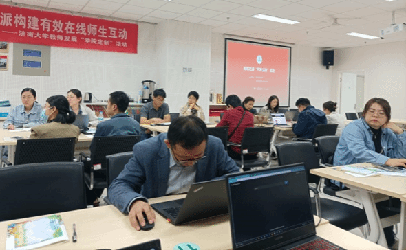教师发展咨询专家、机械工程学院教授王潍受邀担任授课嘉宾。王潍教授从课堂派的安装和使用入手,以自身的课程为例,详细讲解了课堂派的使用方法,以及在课堂建立师生互动的技巧。随后王潍教授从互动课件、弹幕互动、团队协作、小组作业等方面进行了一一演示。授课结束后,参会教师与王潍教进行交流互动,纷纷表示受益良多。