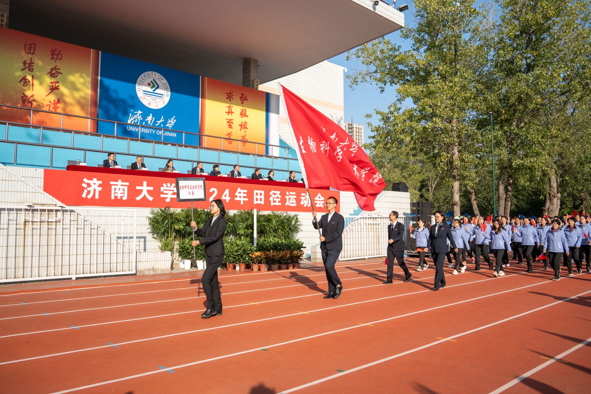 开幕式中,学院教工方阵与学生方阵迈着铿锵有力的步伐,踏着整齐划一的节拍,在旗手的引领下依次有序地走过主席台。运动员们精神抖擞、斗志昂扬,以矫健的身姿、响亮的口号诠释了健康向上、团结进取、奋勇拼搏的积极品质。